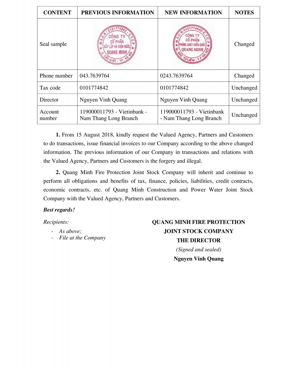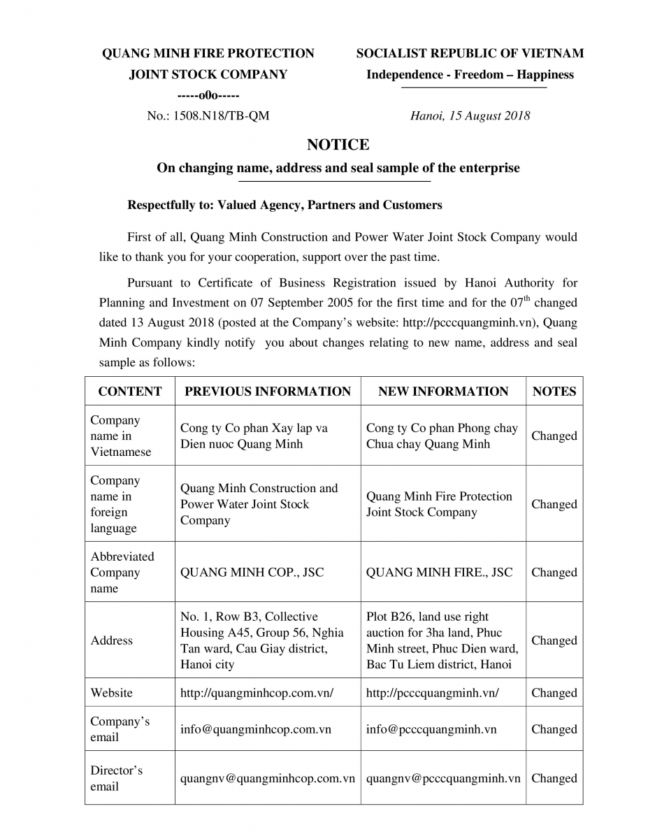 NOTICE ON CHANGING NAME, ADDRESS AND SEAL SAMPLE OF COMPANY